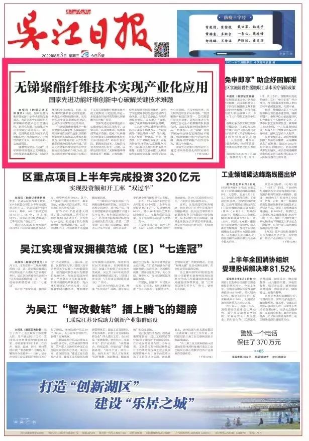 8月3日,《吴江日报》头版头条关注无锑聚酯纤维技术实现产业化应用,国家先进功能纤维创新中心破解关键技术难题。